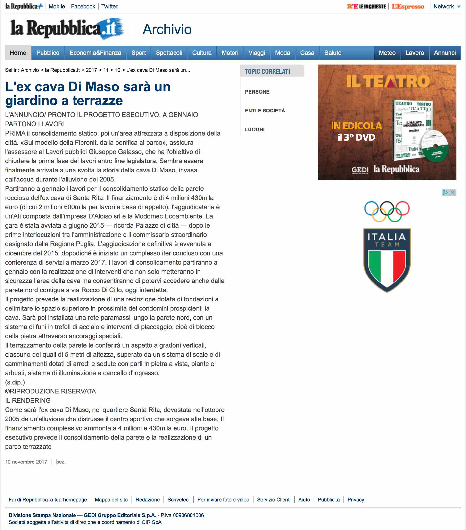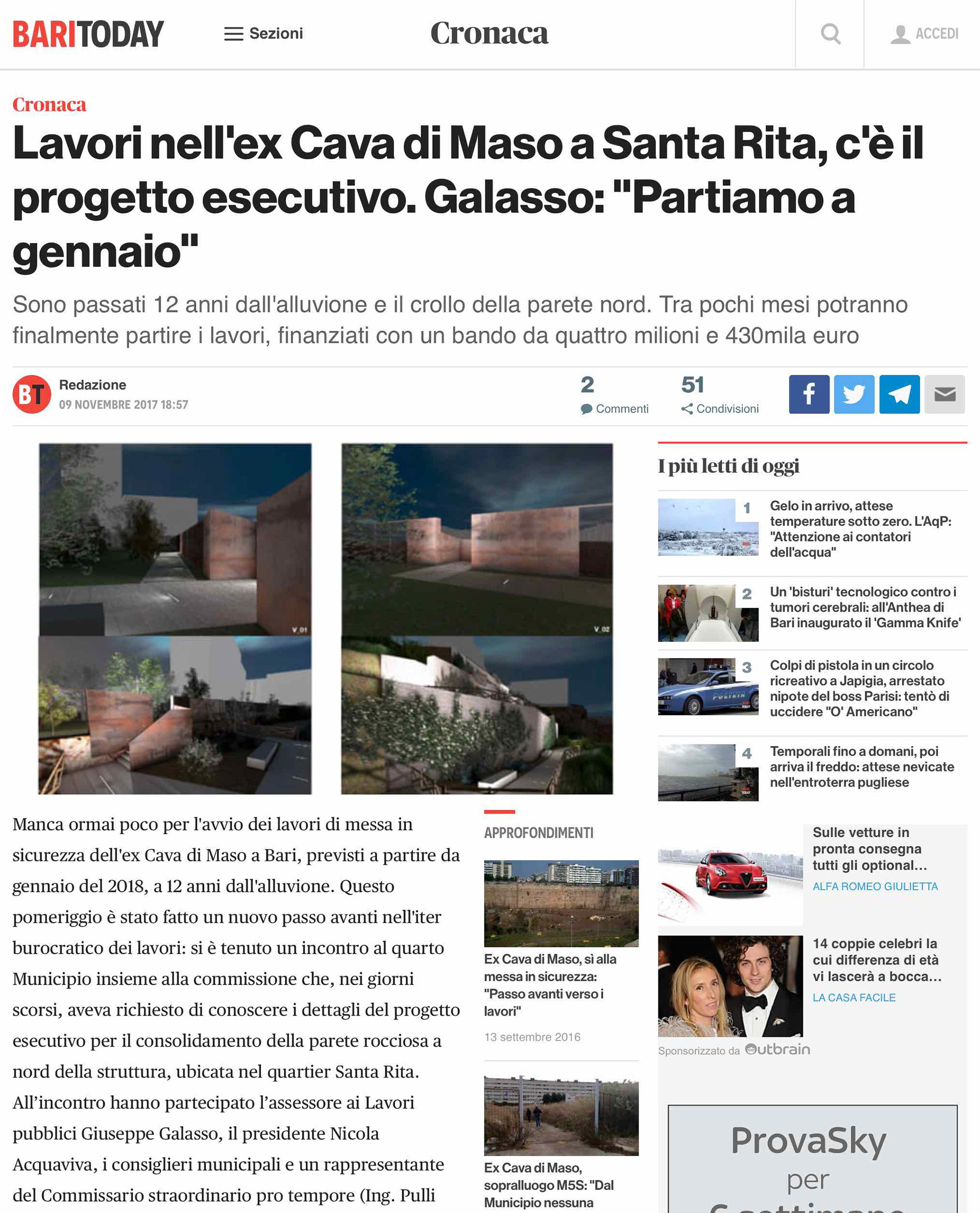 L'intervento riguarda il consolidamento della parete rocciosa nord dell’ex Cava di Maso ubicata nel quartiere Santa Rita - Carbonara 2 del comune di Bari. Il progetto, redatto in A.T.P. con lo studio Romanazzi Boscia a Associati S.r.l. di Bari, è risultato vincitore nell’ambito di una gara pubblica ed è oggi in via di attuazione.