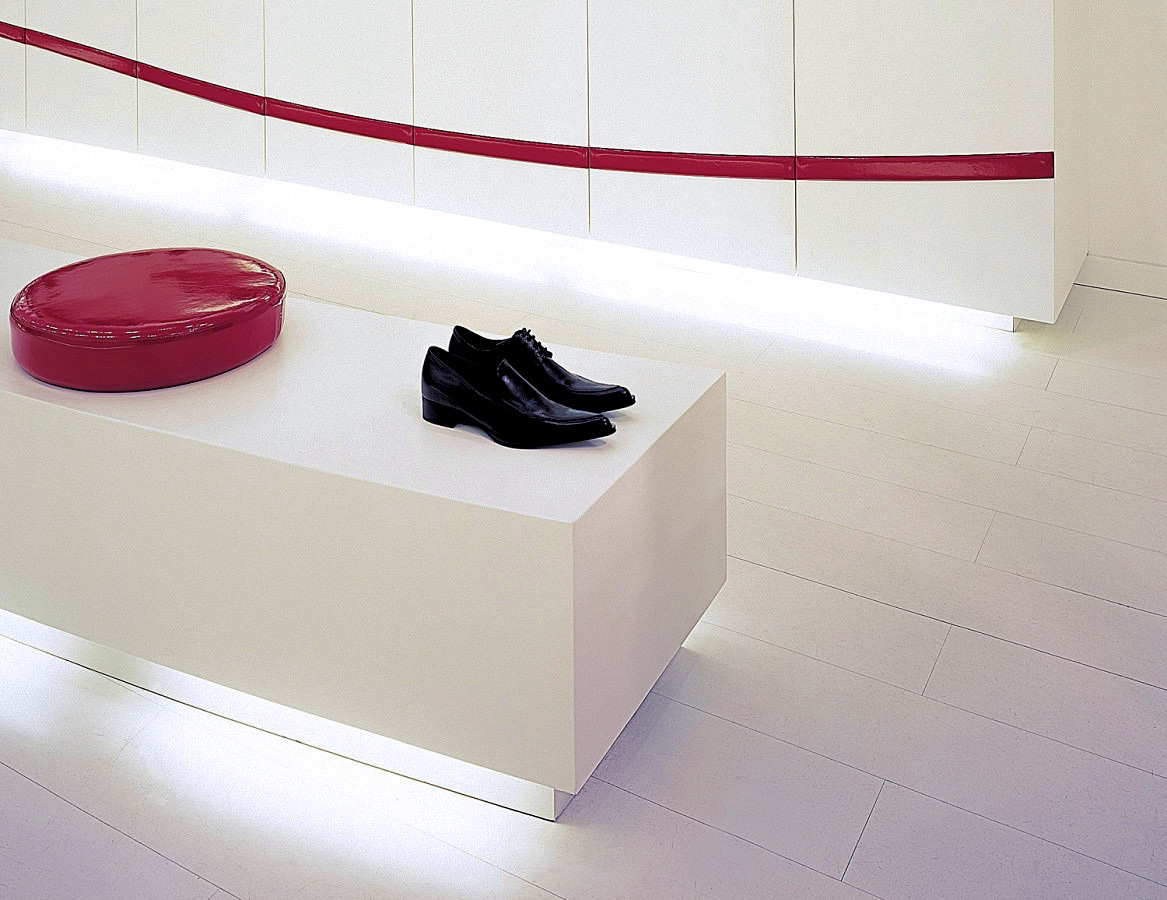 Femme è un progetto che nasce con l'intento di qualificare un prodotto di fascia medio-bassa all'interno di uno spazio emozionale, capace di attrarre clientela abitudinalmente rivolta ad un prodotto più pregiato. L'ubicazione del punto vendita, nella via delle boutique più importanti, poteva costituire un ostacolo sia per il cliente consueto sia per la potenziale nuova clientela. La scelta progettuale è stata indirizzata verso la realizzazione di uno spazio puro e luminoso caratterizzato dalla prevalenza del colore bianco, dove elementi curvilinei conferiscono dinamismo e profondità all'ambiente rettilineo. La luce, posta fra piani e pareti e fra arredi fissi e pavimento, conferisce leggerezza e accentua il protagonismo del prodotto. Il rosso dei piani curvilinei, dei pouf e della quinta sul fondo crea un dialogo con l'idea del lusso e della qualità. Una parete in cristallo extrachiaro acidato fa da quinta infinita ed ospita riquadri grafici retoilluminati ed intercambiabili al susseguirsi delle stagioni.