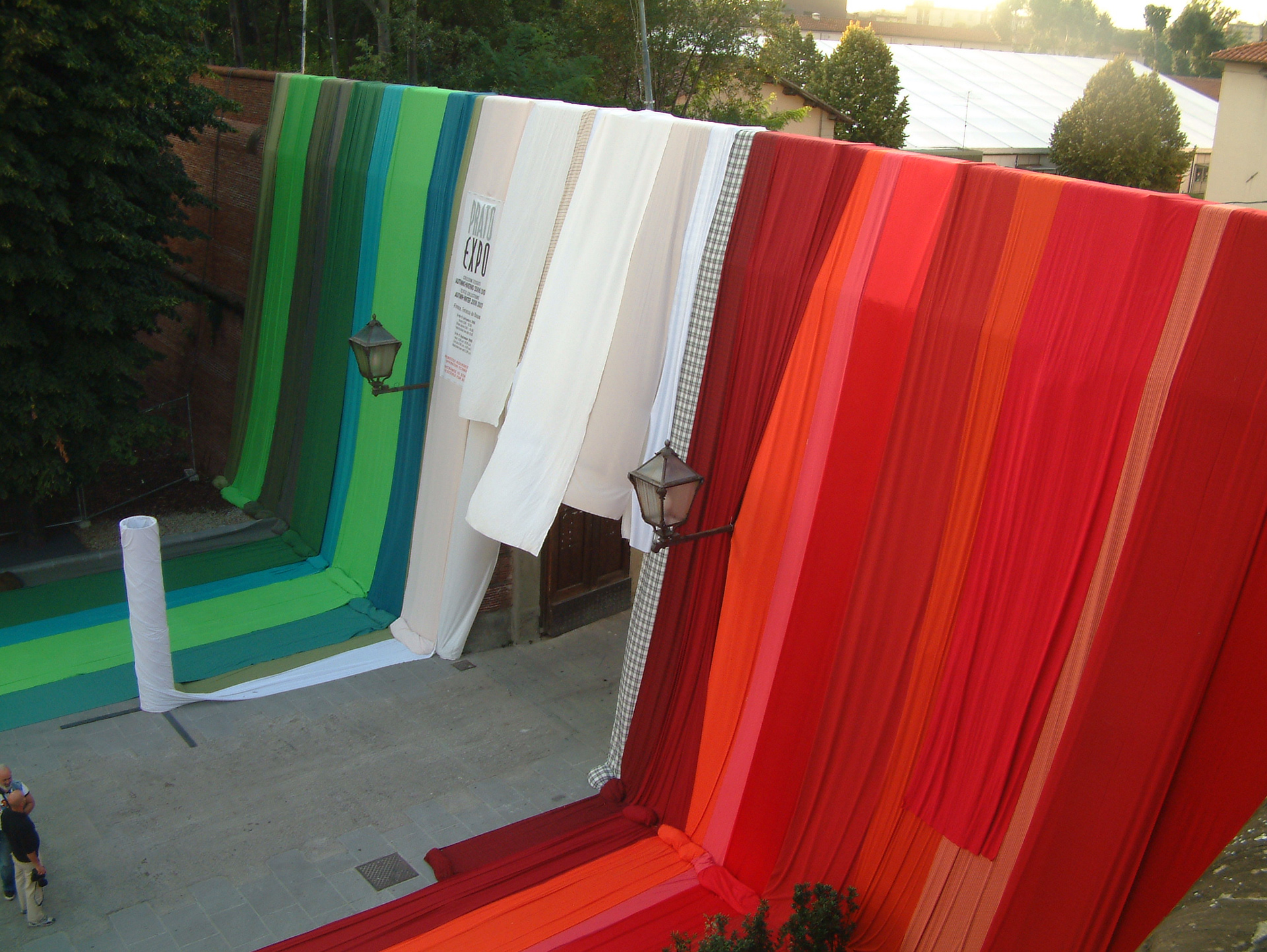 Tre chilometri di tessuto, testimoni di una creatività tutta italiana, debordano dal muro di cinta. Incorniciano il portale di accesso esaltandone la sua imponenza storica e, svolgendosi sul parterre esterno per circa 50 metri, rimarcano l’area di ingresso simboleggiando l’invasione dell’intera area urbana.