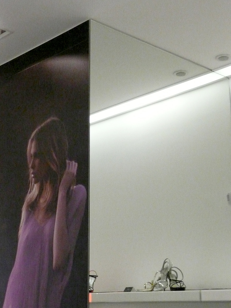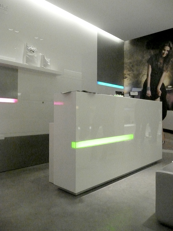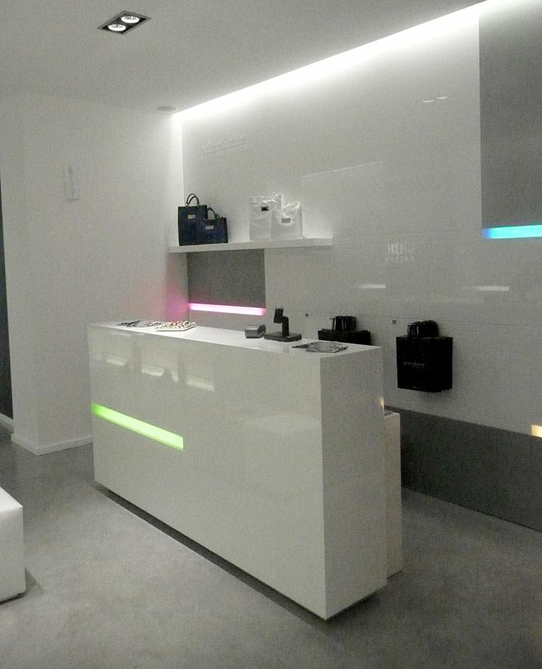 Luce e colore sono gli elementi fondamentali del progetto per una immagine sobria e comunicativa dello spazio. Piani in plexiglass minimali si rincorrono alternando la finitura bianco lucida a quella opalina e luminosa, garantendo flessibilità nell'allestimento ed un efficiente rapporto tra superficie di vendita e superficie espositiva. La luce, quella puntuale e colorata dei piani e quella lineare a soffitto e a pavimento, è progettata per creare un ambiente emozionale, senza compromettere la fruizione del prodotto. La comunicazione, veicolata da gigantografie intercambiabili scientemente ubicate nelle vetrine e all’interno del punto vendita, rappresenta senza dubbio un elemento protagonista e di forte riconoscibilità.
